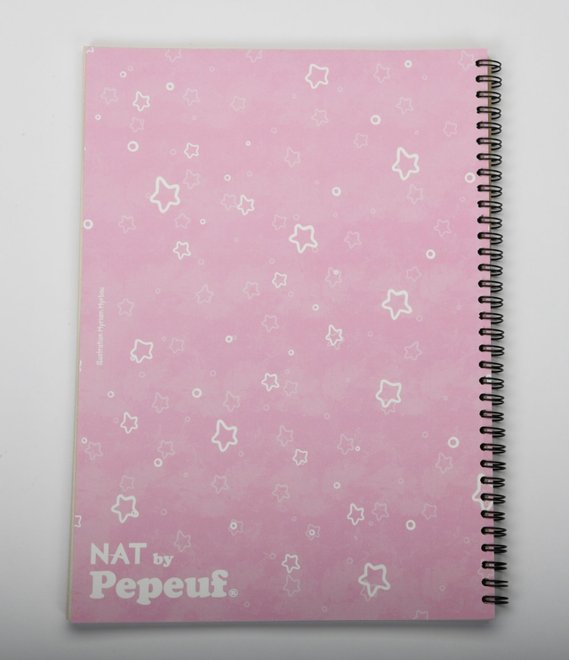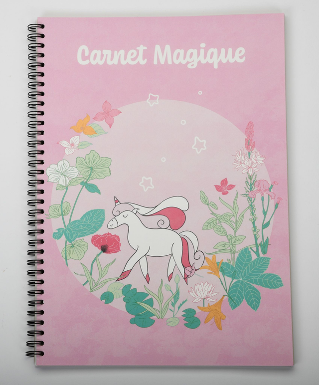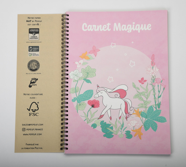 Carnet A4 de la marque Pepeuf portant une illustration faite par Myriam Myrbou appelée " Magique" . Ce carnet est composé de feuilles non blanchies fabriquées à partir de déchets organiques de canne à sucre. Carnet fabriqué en Suisse par la Fondation Polyval dans le canton de Vaud.