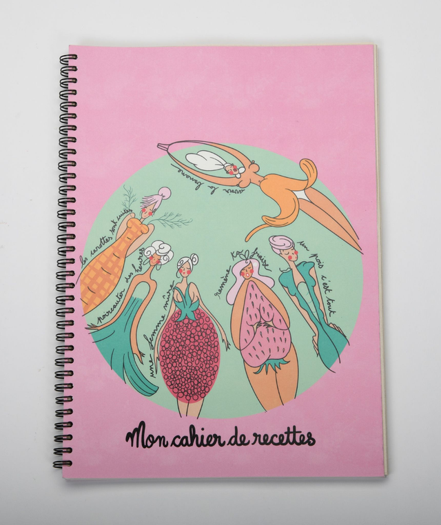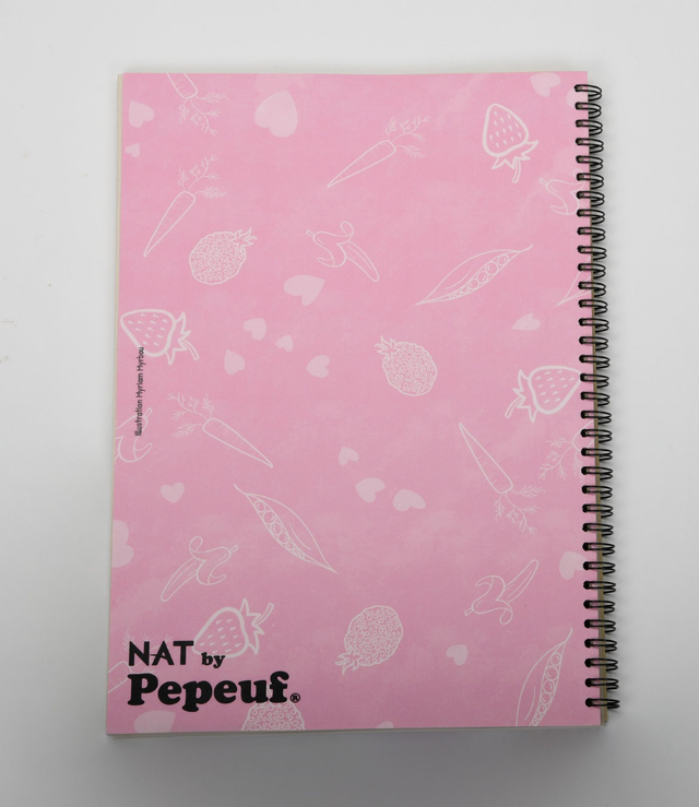 Carnet A4 de la marque Pepeuf portant une illustration faite par Myriam Myrbou appelée " Recette" . Ce carnet est composé de feuilles non blanchies fabriquées à partir de déchets organiques de canne à sucre. Carnet fabriqué en Suisse par la Fondation Polyval dans le canton de Vaud.