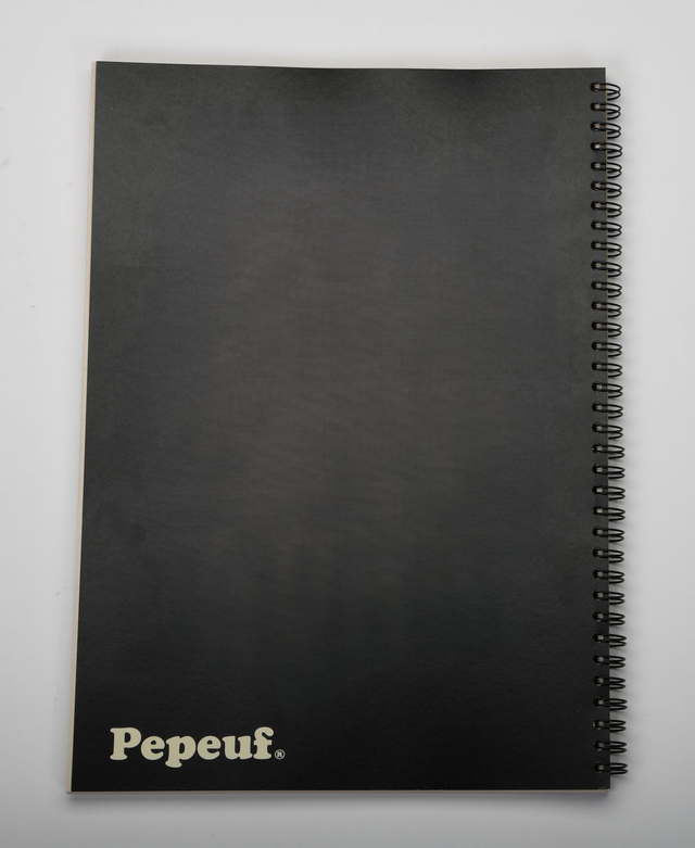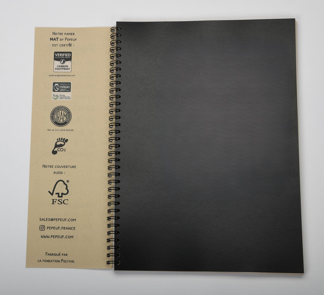 Carnet A4 noir de la marque Pepeuf. Ce carnet est composé de feuilles non blanchies fabriquées à partir de déchets organiques de canne à sucre. Carnet fabriqué en Suisse par la Fondation Polyval dans le canton de Vaud.