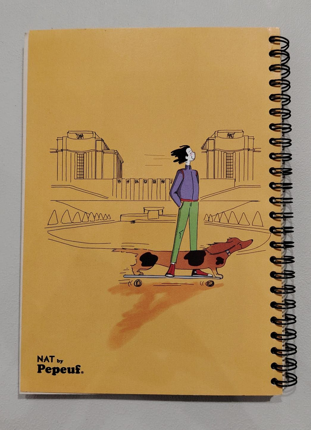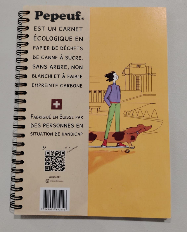 Carnet A5 de la marque Pepeuf portant une illustration faite par Moiselle Isaure appelée "Skate" . Ce carnet est composé de feuilles non blanchies fabriquées à partir de déchets organiques de canne à sucre. Carnet fabriqué en Suisse par deux fondations genevoises.