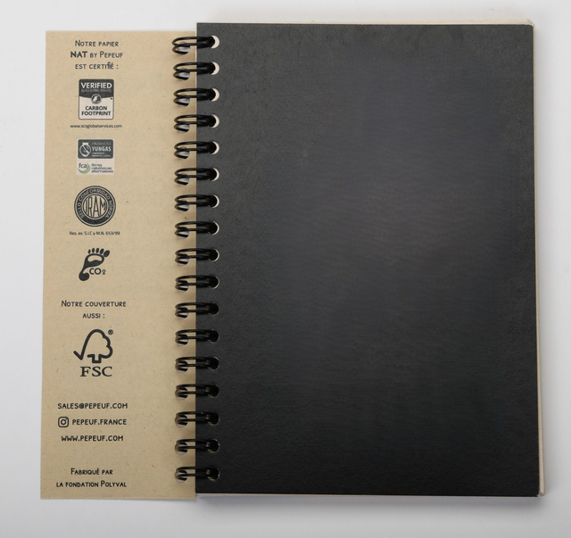 Carnet A6 noir de la marque Pepeuf. Ce carnet est composé de feuilles non blanchies fabriquées à partir de déchets organiques de canne à sucre. Carnet fabriqué en Suisse par la Fondation Polyval dans le canton de Vaud.