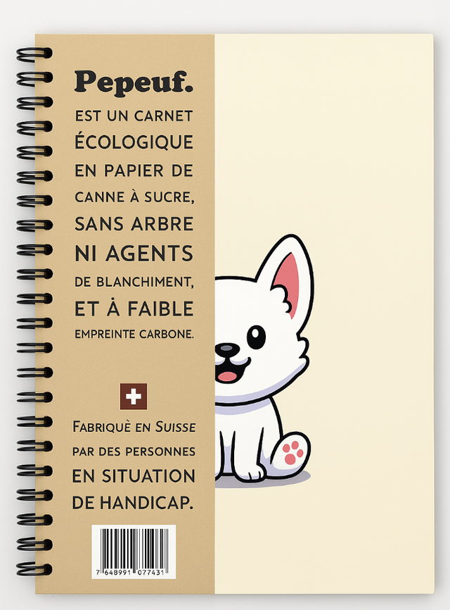 Carnet A5 de la marque Pepeuf portant une illustration appelée " Chien mignon " . Ce carnet est composé de feuilles non blanchies fabriquées à partir de déchets organiques de canne à sucre. Carnet fabriqué en Suisse par deux fondations genevoises.